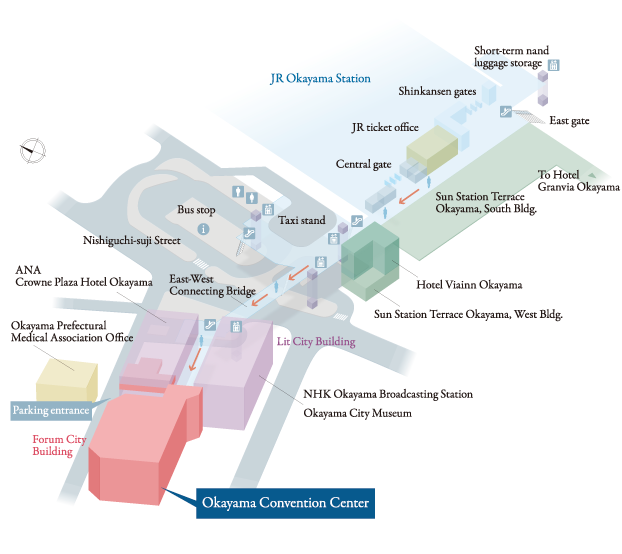 Centrally located in Western Japan on the Seto Inland Sea, in a prime site directly connected to JR Okayama Station, Okayama Convention Center serves as a nexus for people, goods and information.
