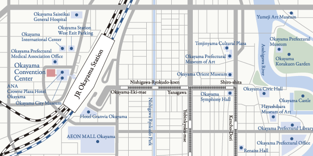 Situated in the middle of Western Japan, Okayama Prefecture is the hub of the region’s economy and offers a comprehensive transit infrastructure that includes railways and highway links to the Kyoto/Osaka/Nara area and Shikoku Island. Okayama Convention Center is just 3 minutes on foot from JR Okayama Station, which is served by the Nozomi Shinkansen (bullet train). With its excellent location, Okayama Convention Center serves as a crossroads for the entire Western Japan region.